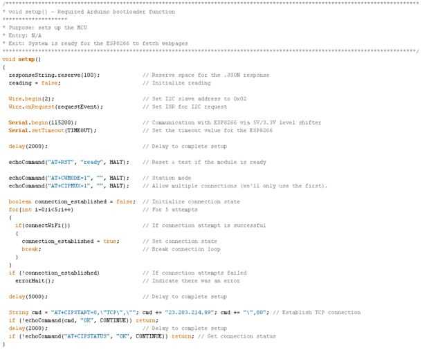 Aquí vamos, esto es cómo conectar nuestro ESP a nuestro Arduino. Había reservado algo de espacio en la parte superior de la respuesta de la cadena. Esto es un asimiento de una iteración anterior del código que había repetido pila accidentes porque la. JSON simplemente había abrumado mi micro pequeño. Probablemente puede lanzar esta línea de código hacia fuera, guardó. Después de eso ves arranque una I2C (TWI, alambre, SMB, lo que sea...) conexión. Esto es donde realmente se va mis datos. Luego viene el Serial. Esta es la conexión con el ESP, observe la velocidad de 115200 baudios. Eso es SUPER importante hacer bien, de lo contrario tu Arduino habla inglés y el ESP habla cantonés y todo el mundo está confundido. Se dará cuenta de que los comandos AT son, que te dije que sería importantes! El código comprueba en primer lugar para asegurarse de que el dispositivo está listo realizar un restablecimiento de software y a la espera de la ESP responder. Después establece el ESP en modo de estación y permitir conexiones múltiples. Podemos conectarnos a múltiples APs, pero para nuestro uso ahora sólo utilizaremos una de las conexiones. Es decir tras un intento de conectarse a la WiFi (función siguiente observamos). Una vez tenemos correctamente (con suerte) conectado a la WiFi que empuje y conectar con nuestro anfitrión (en este caso Wunderground).
