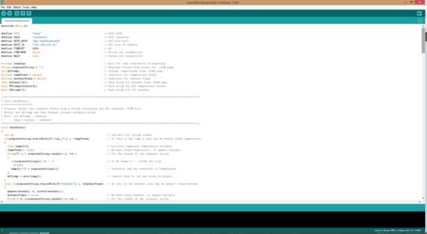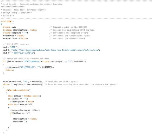 Esta es la última porción importante del código. Esta área se conecta a la API de tiempo subterráneo y descarga los datos. Una vez que el ESP comienza a enviar datos de vuelta nos empuje en la variable de la cadena de respuesta que declaró anteriormente. Capturé los datos línea a línea (empezando y terminando con), y buscó los datos que necesitaba (temp_f y tiempo). Esto mantiene la cantidad de datos que tienda/análisis en hasta un mínimo de tiempo que uno trata de Arduino.