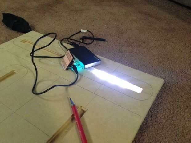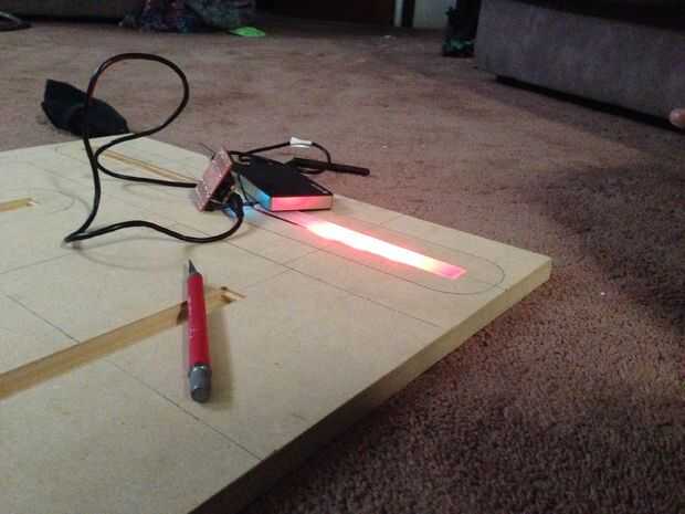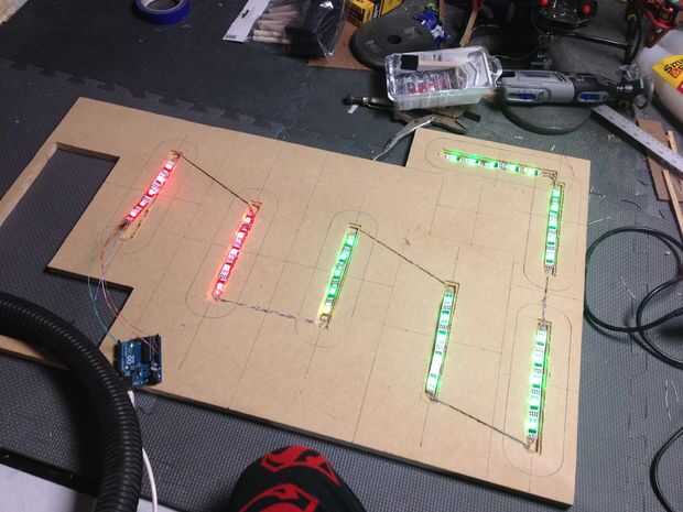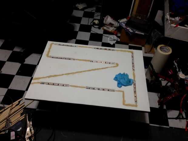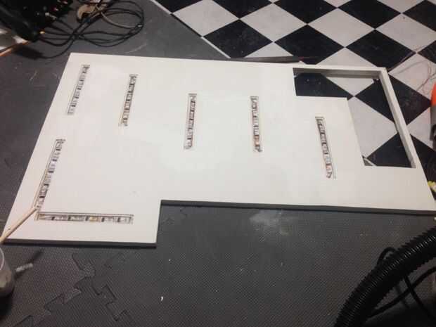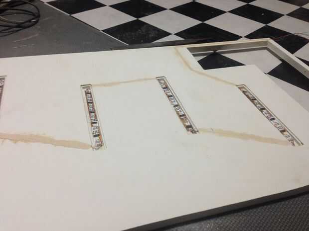 Después de que el funcionamiento de madera fue hecho cortar segmentos de 5 LED de un rollo de WS2801 LED y puso en los canales. Mientras que fueron chillin en los canales medir los cables a la distancia que los LED fueron unos de los otros y soldarlos juntos. Después, tome el LED conectado y los ponen en los canales para asegurarse de que la distancia era correcta. Después de cada sección fue soldado en prueba con un arduino positivas estaban trabajando.