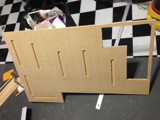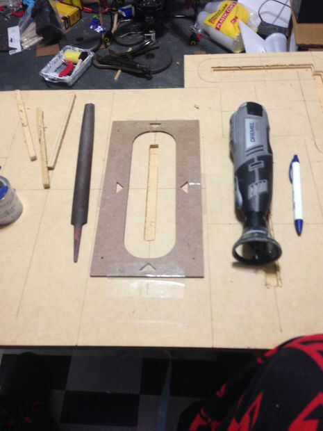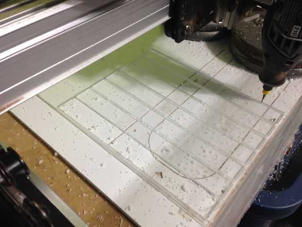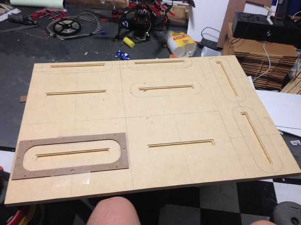 Ahora para la parte impresionante! Ya que mi shapeoko no es lo suficientemente grande como para caber los pisos en he tenido que crear plantillas en sketchup que funcionara con mi dremel. Mide la distancia desde el exterior de la cubierta de enrutamiento dremel a la broca y dos plantillas: una para cortar el canal donde el LED se sentaría y uno para el plexiglás sobre se sentaría en. Para asegurarse de que el LED no va a ser corruptos he hecho pequeños triángulos en las plantillas para alinear a las mediciones que hice en las plantas. Cuando se cortaron todos los canales usé la dremel para conectar todos ellos juntos los cables podrían ejecutar a través de ellos. Luego le puse todos los cables en la caja de un proyecto en la parte superior del condominio.