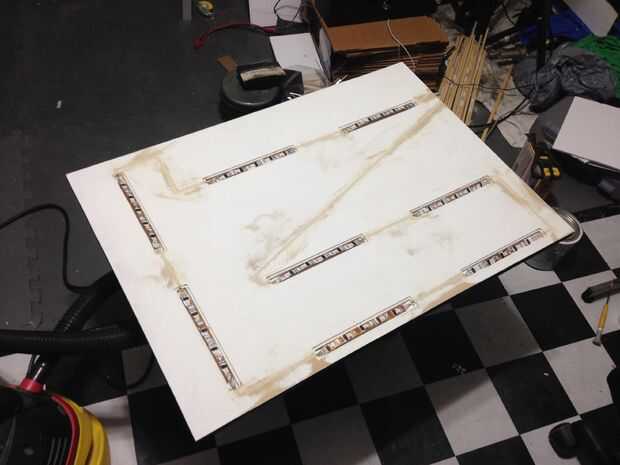 Cuando se hizo el cableado y estaba feliz de que todos los LED estaban trabajando se me quitan todos los LED y cableado de los pisos. Esto lo hice yo podría pintar el interior de la bombilla de canales y dejarlos secar antes de poner nuevamente en. Cuando la pintura estaba seca puse todos los LED y los cables de nuevo en su posición correcta y empezaron cubriendo los canales de cable con masilla para madera. Después de que el relleno de madera fue hecho secado utilizar una lijadora de palma para afeitarse a la parte superior por lo que sería al ras con el resto de la madera. Todo esto hecho pinté sobre los puntos de arenados y nunca se sabe que fueron alguna vez allí.