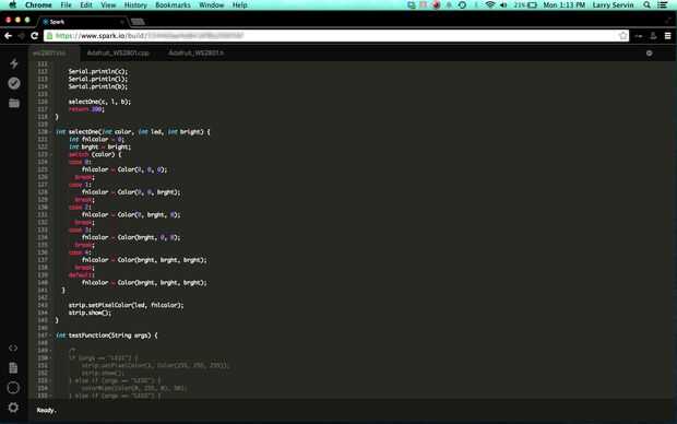 Lo primero que empecé con es conseguir los LEDs WS2801 con la chispa, ya que no sólo se puede incluir una biblioteca como el arduino IDE. Lo que tienes que hacer es crear otro archivo en el IDE de chispa y agregar el contenido de la biblioteca de Adafruit WS2801 al archivo correcto e incluir el archivo .h archivo .ino. Utilizando la función de chispa en el IDE hice una función para trabajar con javascript en el lado del servidor para distinguir los diferentes ID ' s de HTML para las diferentes secciones de LEDs. Con unos interruptor de case, if & función, que todo funcionó. Si usted está interesado en el código sienta libre de entrarme en contacto con! Estaría más que feliz para que pueda comprobarlo! y quizás incluso conseguir algunos cambios.