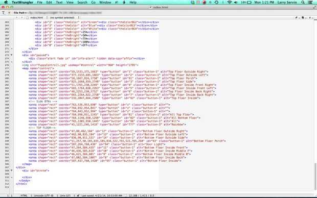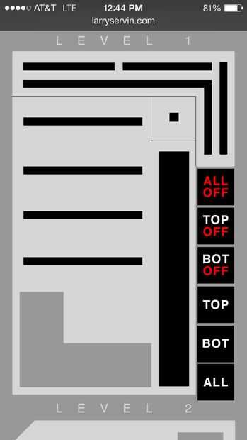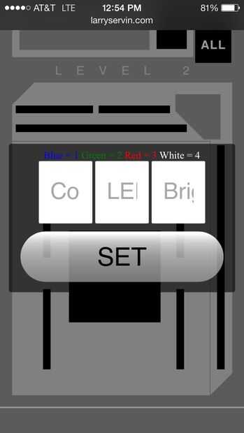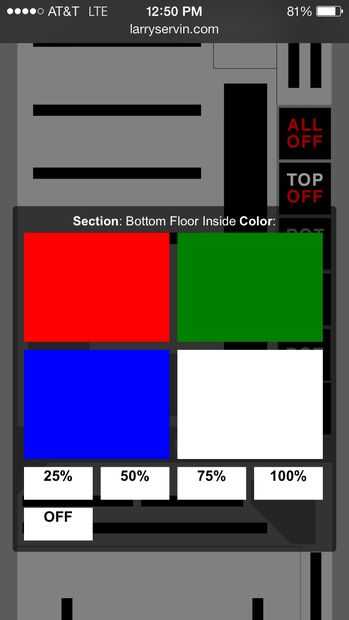 No quiero siempre tener que manualmente enviar comandos a la chispa, así que quería crear una aplicación realmente simple de poco para cambiar los colores de luz y brillo. Además, he querido familiares y amigos para poder jugar con él. Así que primero he creado un diseño en photoshop de los pisos superior e inferior. Cuando se hizo la imagen, he creado un mapa de imagen ir sobre todos los tramos de luz (barras negras en el gráfico). Con la ayuda de JQuery he creado una pequeña ventana emergente que puedo elegir colores y brillo cuando hago clic en cualquiera de las secciones. También creé un popup que específicamente puedo elegir cualquier LED en el condominio y el color.
