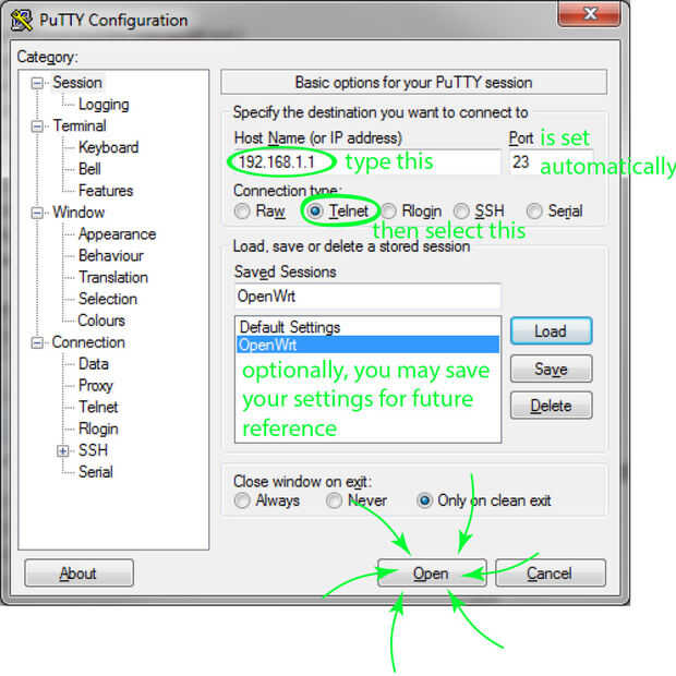 - Ahora vas a telnet ("creado un enlace en la red para poder utilizar el sistema operativo") al receptor. Para el telnet trabajar, el ordenador (el cliente) debe tener dirección IP 192.168.1.2, por lo tanto nuestro fastidiando con la dirección IP anterior. El receptor (también conocido como el Host) tendrá la IP 192.168.1.1. Así que, aquí vamos: en PC, ir a buscar la masilla si no lo tienes aún. Es gratis, muy pequeño y modular (no necesita instalación). Descargar el putty.exe uno. Después de la descarga, haga doble clic en él y configurar por lo que parece la segunda captura de pantalla.