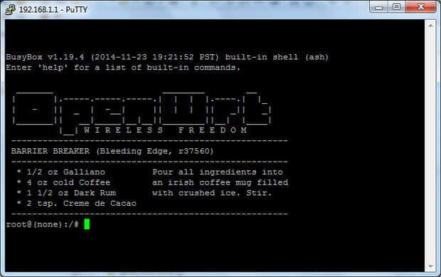 - Cuando estés listo, toma una respiración profunda y haz clic en el botón abrir. Usted entonces debe ser recompensado con la hermosa pantalla negra de la imagen #3: OpenWRT automáticamente nos inicia como root. (Linux-ese de "todo poderoso super usuario") Ahora estamos listos para hacer algunos Linuxing!