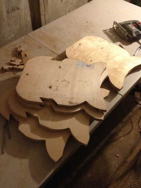 Utilicé una sierra de calar para recortar esta primera forma. Cuando se corta, coloque en la madera contrachapada y utilizar el router con un poco de corte al ras para seguir la primera forma. Con una broca de descarga básicamente seguirá la primera forma exactamente. Repetir este proceso para que tenga cinco formas idénticas.