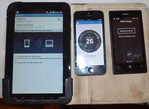 Para probar la aplicación sólo necesitaría poder cambiar las conexiones Wifi y monitorear el estado de mi nido. Para ello que sacó de mi Tablet Android que tiene su propia tarjeta Sim, por lo que se podría utilizar una segunda conexión Wifi (mi conexión debe ser activo para poder llamar a la API del nido al que no estaba conectado a mi red doméstica). Usé el nido de la aplicación en mi iPhone de trabajo para supervisar el estado del nido. Mi Nokia Windows Phone funcionaría mi Custom Windows 8.1 App.