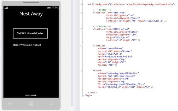 Ya que básicamente es un fondo de la aplicación, la interfaz es bastante básica. Solo botón y un bloque de texto junto con el encabezado y pie de página... Estoy seguro que hay más recomendado: maneras de hacer esto, pero esto fue simple y funcionó. Yo básicamente sólo arrastra los componentes de la caja de herramientas, los coloca y actualiza la configuración.