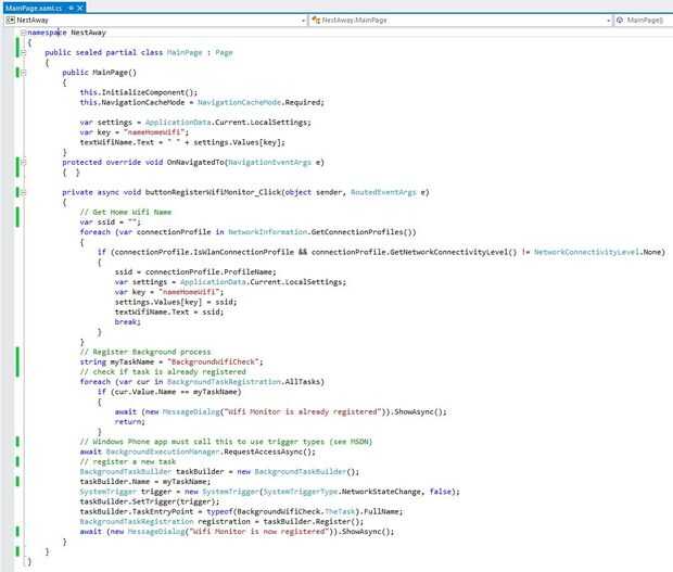 Si el Wifi de casa no se ha establecido o necesita reajustarse porque usted cambió su nombre de Wifi el código siguiente se llama cuando se hace clic en el botón "Configurar Wifi Inicio Monitor". Básicamente los lazos a través de las conexiones de red en el teléfono y encuentre el activo. Este nombre está escrito entonces para almacenamiento local y aparece en la aplicación en el bloque de texto.