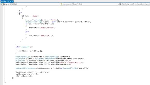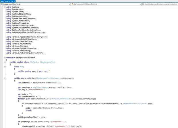 Cuando el proceso de back-end se llama de un cambio de estado de la red lo primero que hace es obtener el nombre actual de la conexión de Wifi. Esto entonces se utiliza para comparar con el nombre de casa Wifi almacenado.