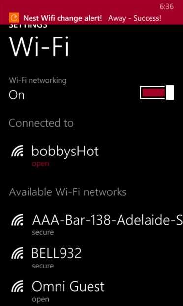 El siguiente paso es determinar si necesita actualizar el nido. Verificar el nombre de Wifi Inicio contra el actual nombre de Wifi y si son iguales y la situación actual es "Away" llamada de la API de nido para establecer el estado de la "Casa" si el estado es ya Inicio I no hacer nada. Mismo pues si no coinciden los nombres de Wifi, si estado actual está casa que actualizo a lejos más no hacer nada...