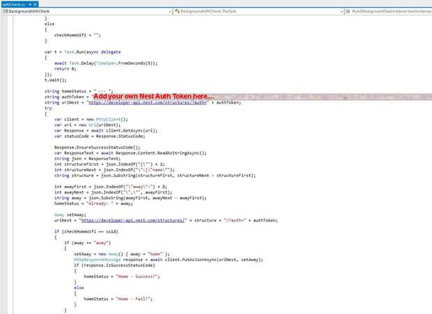 Oh, otro atajo tomé que es malo... pero había quise cambiarlo y luego me olvidé... El "Auth Code" para nido está codificado en la aplicación (primera línea de abajo). Esto significa que la aplicación no puede ser compartida como es. Lo que haré a continuación (cuando tengo tiempo) es crear una variable para el código de Auth y editable en la configuración inicial de la aplicación al igual que el nombre de casa Wifi. Excepto que tendría que ser entró en un cuadro de texto y luego guardar en almacenamiento local. Es un código muy largo por lo que al principio tomé el atajo, pero podría siempre por correo electrónico a su teléfono y luego simplemente copiar y pegar en la pantalla de ajuste.