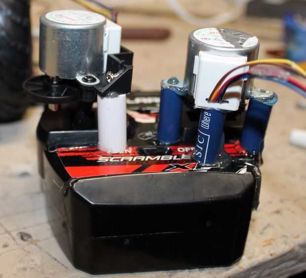 El motor de inclinación tenía un disco de 3/4 montado en él, y el motor del pan tenía un engranaje. Con mi dremel, yo tallado el engranaje para ver más como el disco en forma de pacman en el otro motor. Luego, utilizando una aplicación liberal de pegamento caliente y segmentos de una pluma de plástico como soportes, conectados los motores al control remoto. Que convierte los bordes del recorte en el disco y el engranaje de empuje las palancas de mando para girar a la derecha o izquierda, o ir hacia delante o hacia atrás! No son perfectos, pero definitivamente funciona.