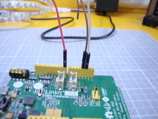 Recuerda que usando las clavijas 3 y 9 es necesario y no se puede cambiar ya que son los pines PWM sólo de Linkit. Puesto que hay solamente dos de ellos, el tercer color de la tira de LED debe ser controlado a un pin digital normal.