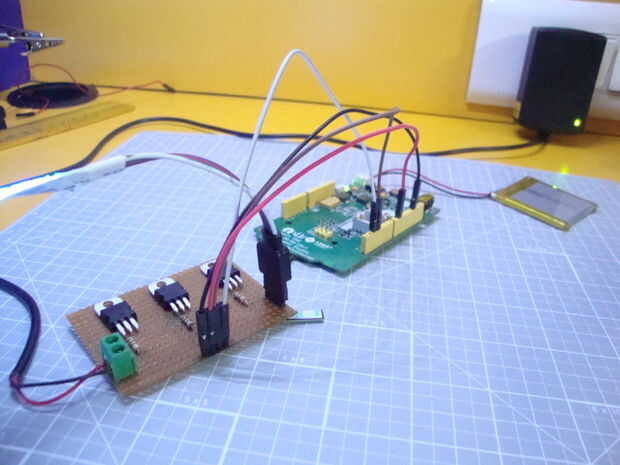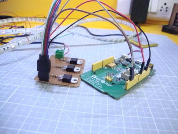 En este paso, puede medir y cortar la tira según sus requisitos. Asegúrese de que usted corte solamente de los puntos marcados presentes a una distancia de 3 LEDs. Después de cortarlo, puede conectarlo y probar encendiendo Linkit uno. Como todos los pernos son altos de forma predeterminada, los tres colores se iluminan produciendo luz blanca.