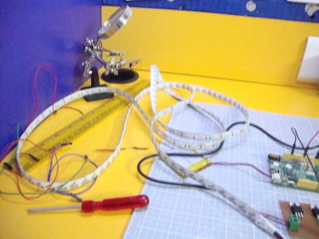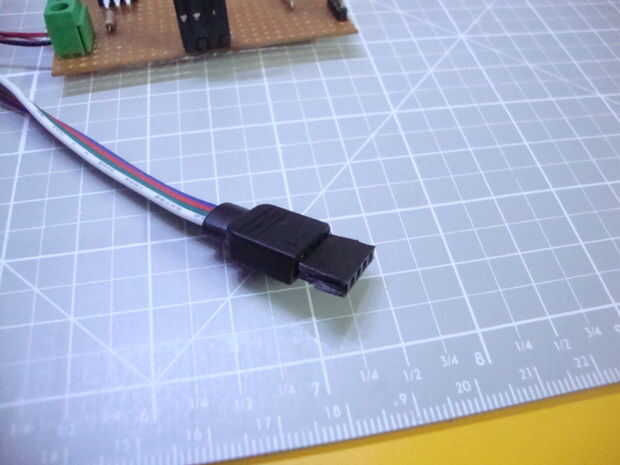 El siguiente paso es conectar la tira del LED al circuito de soldado. Hacerlo enchufando directamente la toma de corriente en las cabeceras de macho en el perfboard. Si usted no tiene un zócalo incorporado conectado a la tira, entonces necesitará cuatro alambres de la tira a la Junta de la soldadura. Look para las almohadillas de cobre pequeño situado en la franja desde donde has cortarlo. Retire la cinta de 3M en la parte posterior para que el cobre debe estar expuesto.