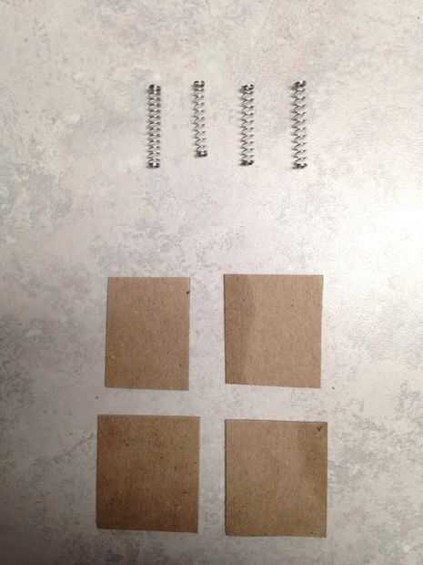 El primer paso es reunir todos los materiales que necesitas. Utilicé cuatro pequeños manantiales de bolígrafos y cuatro pequeños cuadrados de cartulina para cada uno. Para el cuerpo del robot, utilicé una pieza de plástico de la caja que mi teléfono, aunque se puede utilizar prácticamente cualquier cosa plana de 2,5" por 5". También usé un pequeño ventilador personal de la tienda de dólar para el caso del motor y la batería. Para mantenerlo todo junto, utilicé una pistola de pegamento caliente.