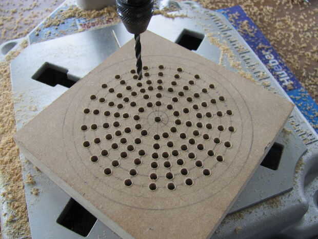 Descargar y transferir los patrones adjuntos en las piezas de madera tan precisamente como sea posible. Si marca sólo un punto en cada centro de los círculos mejor cuando se utiliza la Dremel.