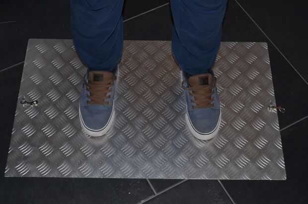 Utilizamos un rígido elástico para encender/apagar el botón B del mando Wii. Esto libera la bola de bolos en el juego. El momento del punto de lanzamiento es dependiente de una cuerda elástica conectada a la placa, donde el usuario se encuentra en.