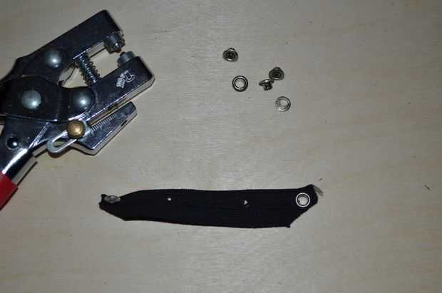 Los ojales se pueden agregar mediante un tipo especial de pinzas (que se pueden encontrar en cada tienda de hardware). Asegúrese de que conectar los ojales lo suficiente, por lo que no salen cuando se utiliza el accesorio.