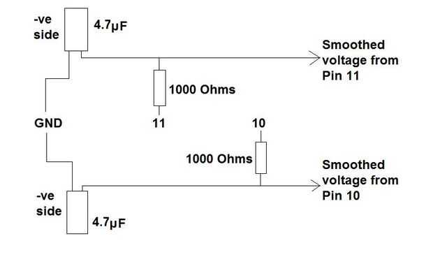Salida los pines 10 y 11 producen un voltaje variable. Sin embargo esto es como una serie de pulsos de 0 o 5V. Para utilizar éstos como una entrada de señal de control de voltaje variable a otro dispositivo (como un comando de dirección por ejemplo donde 2.5V sería "recto") tenemos que suavizar los impulsos de onda cuadrada en una tensión estable adecuada.
