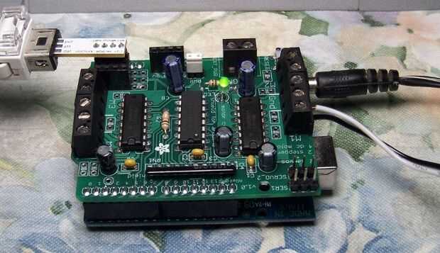 Arduino: fuente de alimentación 12V enchufado en el jack de 2,1 mm. La junta puede conseguir energía desde el USB conectado para programarlo, pero el USB no puede suministrar suficiente energía para que el tren. Confía en mí, accidentalmente he intentado más de una vez.