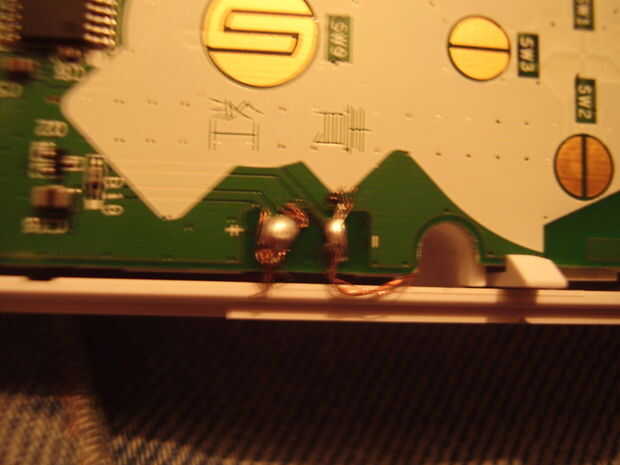 Una vez que tienes tu LED en el botón B y el cable soldado en el LED vuelva a poner su PCB en la parte inferior de tu wiimote (Asegúrese de tener el cable hacia fuera a la derecha de la función de vibración) y luego verás el cable para el rumble y un pequeño + y - en la cima de la PCB (ver cuadro uno) y el alambre de la soldadura forman el LED de la PCB (prueba este fuera antes de la soldadura final)