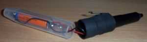 11. utilizando el araldite, añadir algun pegamento para el tubo termo retráctil alrededor el LED y luego en la parte superior del interruptor para que no caiga.