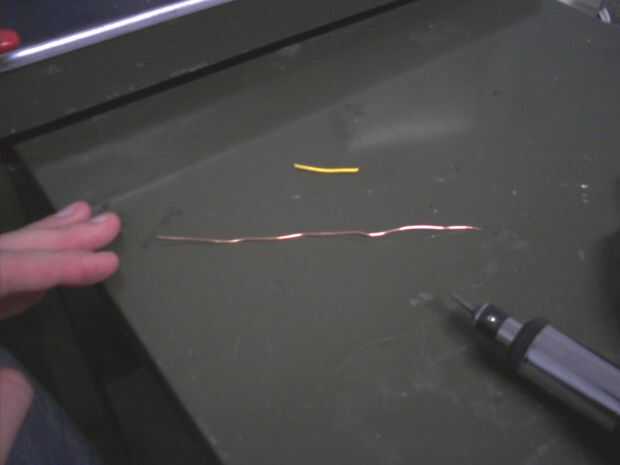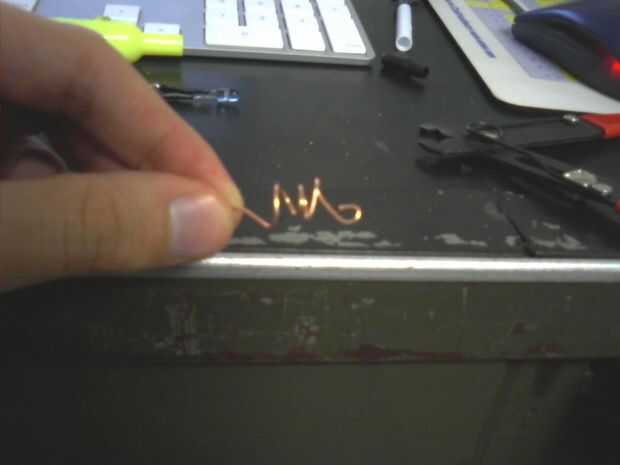 Para asegurarse de que la batería tiene un buen contacto, iban a construir algunos resortes del cable de calibre más pesado, similar a los que se encuentran en soportes de batería 'real'. La forma más sencilla de hacerlo es utilizar un par de pinzas para envolver el cable pelado de alto calibre en una serie de bobinas, a continuación, tire de los extremos para que la bobina se expande en una fuente.