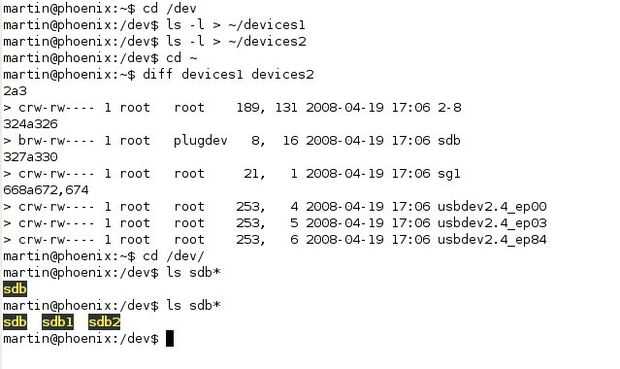 Veremos, además de la que vimos anteriormente (por ejemplo, "sdb") otra entrada con un número después de él, por ejemplo, "sdb1". Esto representa la partición en la tarjeta CF, mientras que la entrada con ningún número (sdb) representa la propia tarjeta. Ver imagen 2