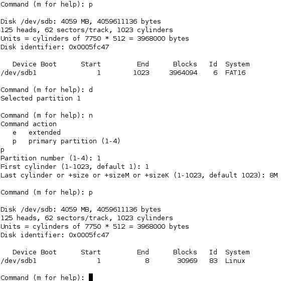 Ahora teclee n para una nueva partición, p para primaria, 1 para la partición 1, 1 para empezar al principio del disco, 8 M para hacer 8 MB de tamaño