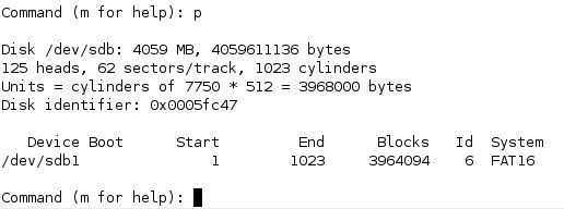 Teclee p para imprimir la tabla de partición - si aparece una entrada como esta, tipo d para borrarla. Tipo p para comprobar allí son no particiones restantes - si hay, tipo d otra vez para quitar cualquier los restantes. Ver imagen 1