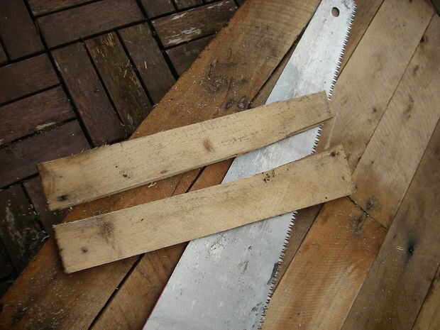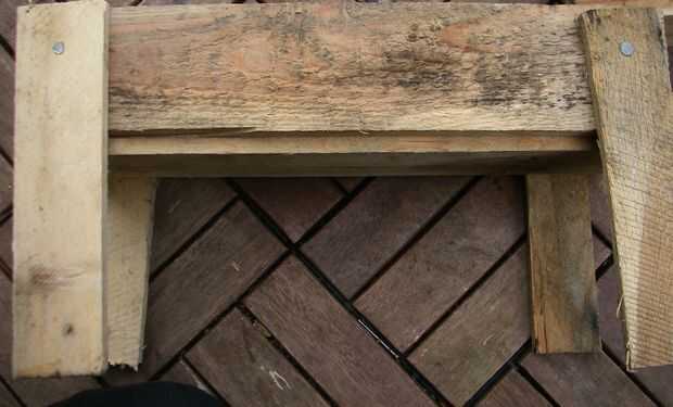 I simplemente cortar dos listones cortos y luego cortarlas longitudinalmente para crear cuatro patas flacas. Estas se celebran por un clavo cada uno, que hace que sean ajustables.