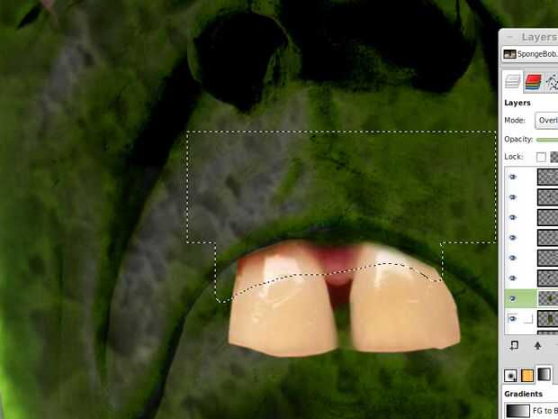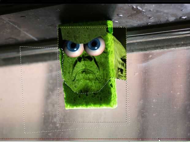 Primero lo que prefiero dirección está mi selección, cortar, recortar, pegar, etc. En el caso de este ejemplo que necesitaba preparar la esponja para tener un rostro, brazos y piernas. Era la medida de mi previsión cuando primero obtuve la imagen de fondo.