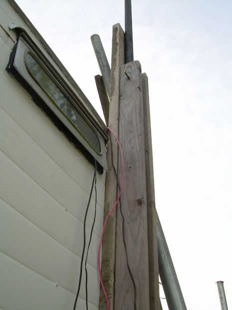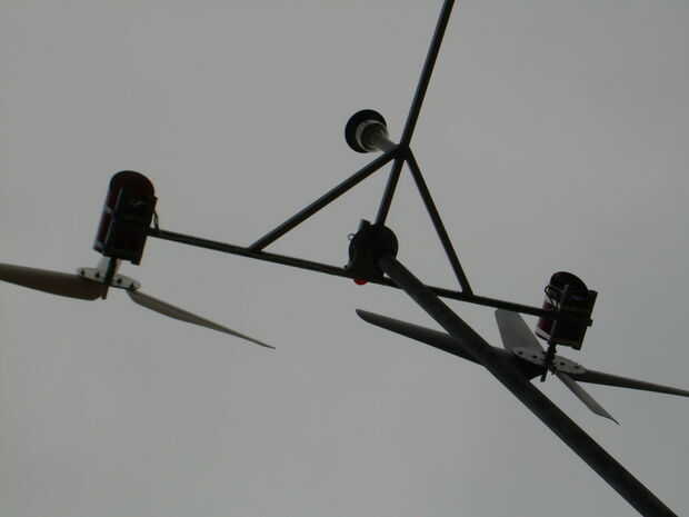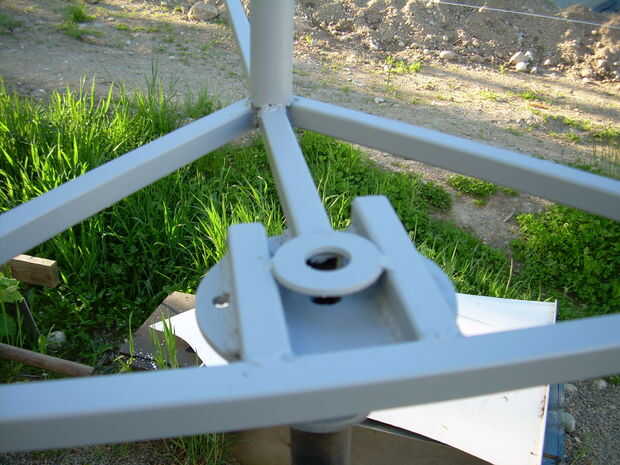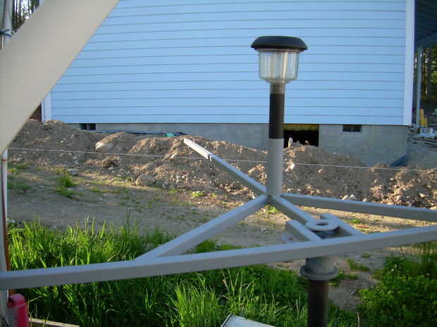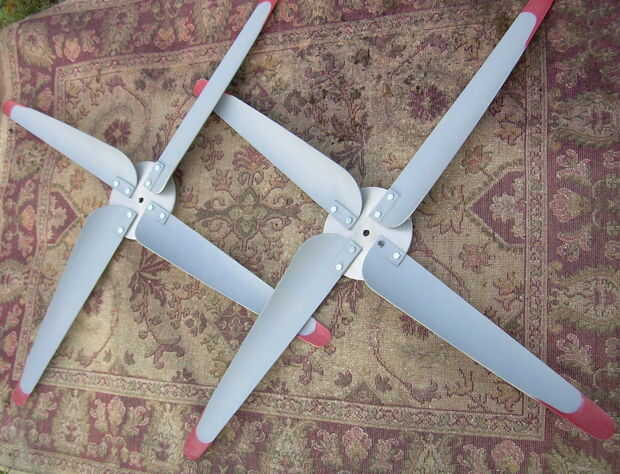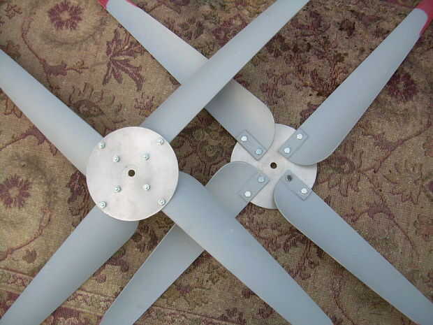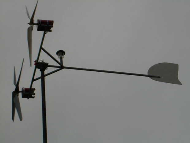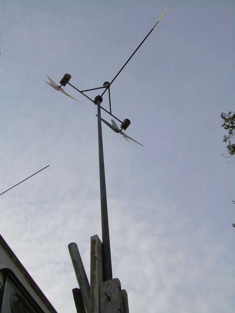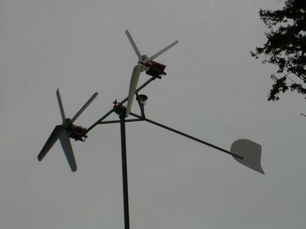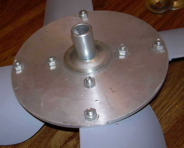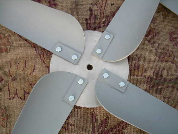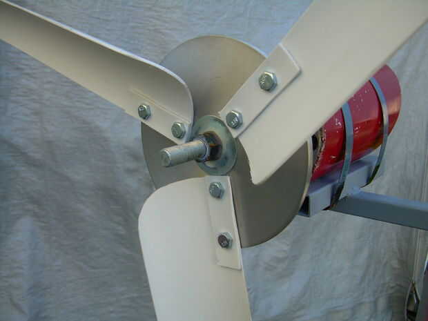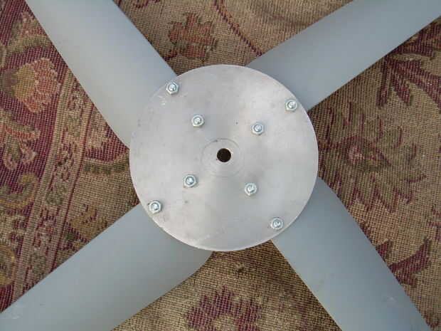 This is a wind generator that I built with 2 Ametek 30 Motors. Está aún en fase experimental, con 3 cuchillas 0n 1 y 4 del otro. El apoyo de la 4 hoja tiene una hoja de Sierra de hub (no recomendado). Va a utilizar la configuración de la 4 hoja en los que estoy construyendo ahora, junto con un eje de aluminio. Ahora estoy trabajando en un conjunto nuevo de hojas.