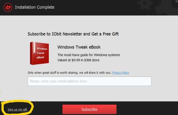 En esta configuración, asegúrese de desactivar "Advanced SystemCare". En la primera foto, le dará una opción de regalo. Asegúrese de ir al botón de la izquierda de la pantalla y haga clic en "Dar para arriba mi regalo".