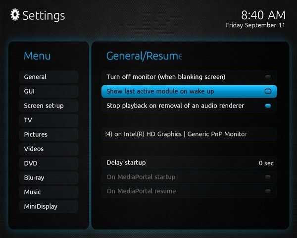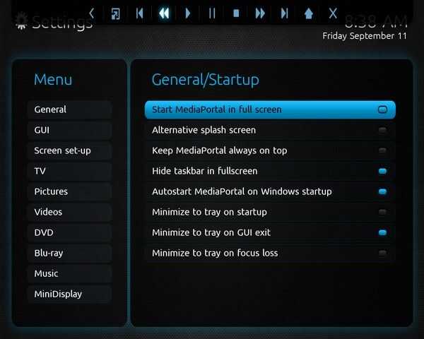 Mi elección de software de centro de los medios de comunicación fue MediaPortal ( http://www.team-mediaportal.com/ ), aunque hay otras opciones que puede utilizar (por ejemplo, Kodi). Una vez instalado, cambie la configuración como se muestra en las imágenes, para que se ejecute al inicio.