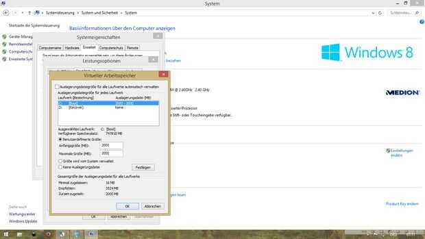 Haga clic en la parte inferior de la memoria Virtual, se abre una ventana. El archivo de intercambio es generalmente administrado por el sistema, pero no suficiente. Poner un cheque en tamaño personalizado.