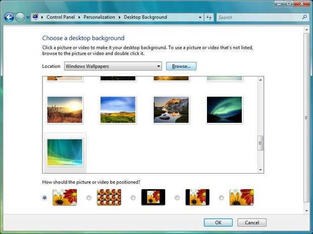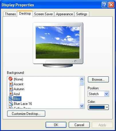 Derecha haga clic en el escritorio, haga clic en propiedades. Haga clic en la ficha escritorio y luego en el botón Examinar para buscar la imagen. Seleccione la opción "Stretch" para la posición y luego en Aceptar para aplicar el fondo.