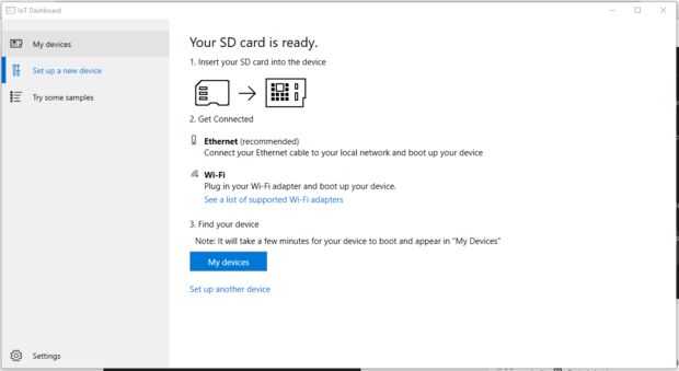 En primer lugar, haga clic en "Configurar nuevo dispositivo". Seleccione su dispositivo: frambuesa Pi 2 y Windows 10 IoT Core para Raspberry Pi 2. Insertar una tarjeta SD con al menos 8 GB de espacio en él (Esto borrará completamente la tarjeta, se perderán todos los datos). Colocar la tarjeta SD en el ordenador.