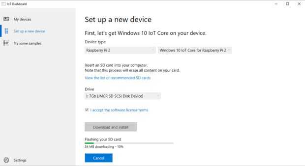 Haga clic en "Descargar e instalar" después de WinIoT descargar el software, le pedirá a borrar y escribir seguirá tu SD Card!
