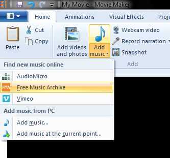Parte 1: Ahora que la película tiene un título y créditos pantalla, puede que desee agregar música a él. Haga clic en el botón "Agregar música" para abrir explorador de Windows y desplácese a un archivo de audio guardado en su ordenador. Si usted no tiene ninguna música en su computadora, o está buscando algo diferente a lo que tienes, puede hacer clic en la flecha pequeña al lado del botón "Agregar música" y encontrar algo desde el sitio web "Archivo de música libre".