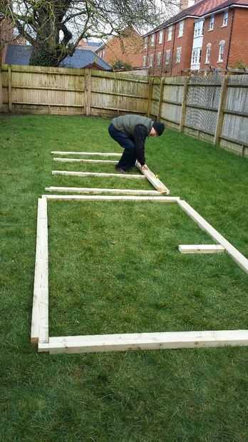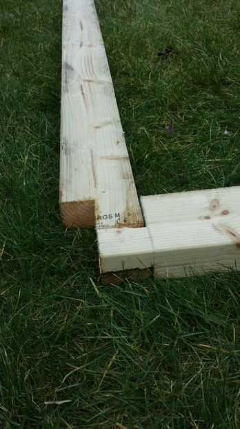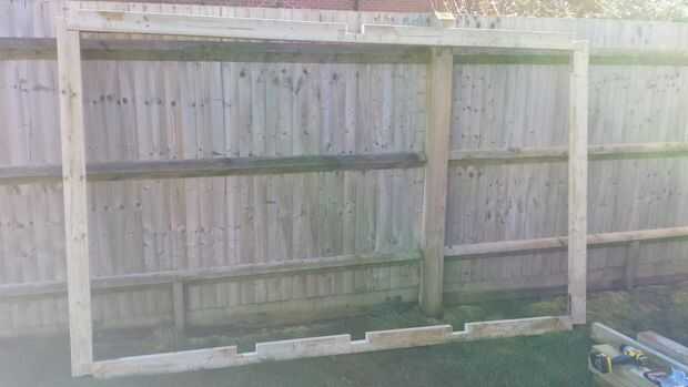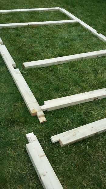 La primera cosa a hacer es construir dos marcos rectangulares de 2' por 4' maderas. Los marcos delanteros y traseros son idénticos, excepto que el marco frontal es 1,7 m de altura y el marco posterior es menor en altura 1,6 m dar una pendiente a la cubierta. Cada fotograma es 2,9 m de longitud.