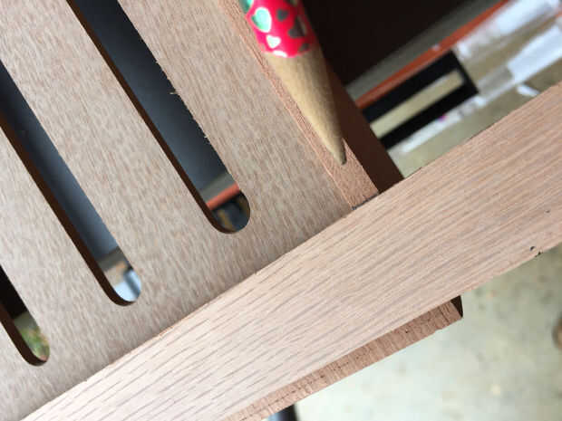 Usted quiere tomar la parte inferior "labio" de lado largo de la bandeja completa - se trata de la más amplia franja de cedro que hará la diapositiva del cajón y cortar 2 @ 1" muescas en el otro borde largo para las piezas de cedro transversal que unirá las 2 bandejas.