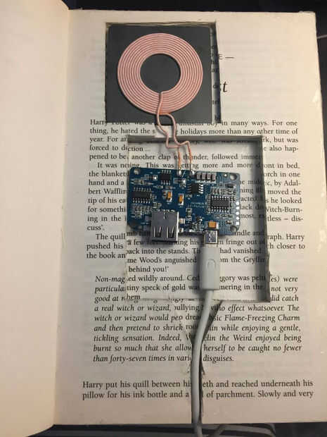Coloque el transmisor en el libro, pero no adhiera nada todavía! Enchufe el transmisor cerrar el libro y usar el teléfono para probar la plataforma de carga. Tenga en cuenta que la almohadilla de carga probablemente tendrá su teléfono para estar en apenas el lugar derecho. Puede pasar algún tiempo desplazar el teléfono en la parte superior de la guía hasta que la pantalla se ilumina y suena el teléfono.