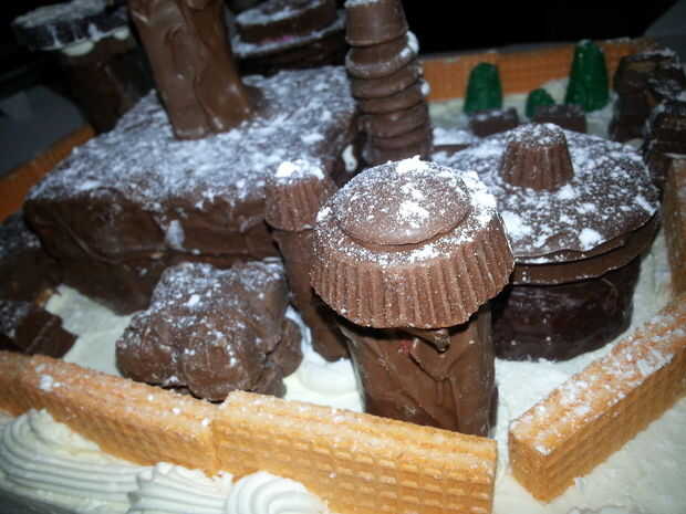 La gran plaza en el centro es de dos capas de pasteles de lujo con 4 pasteles en cada capa. Utilice el chocolate derretido para "unir" las piezas.