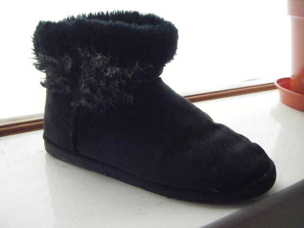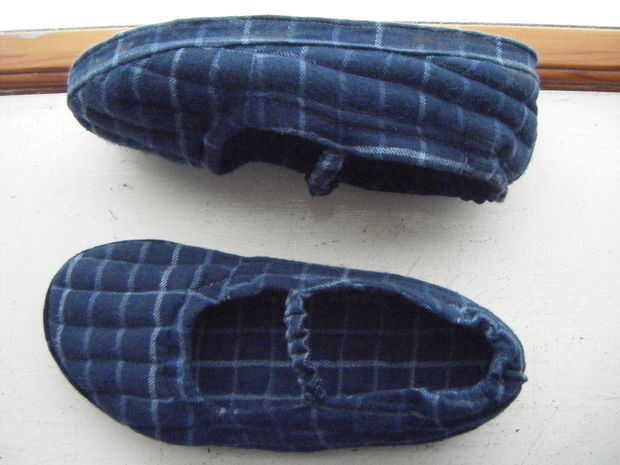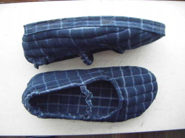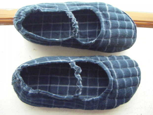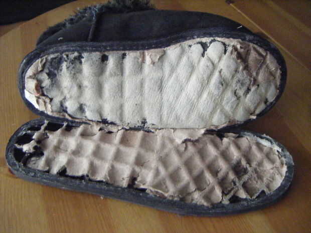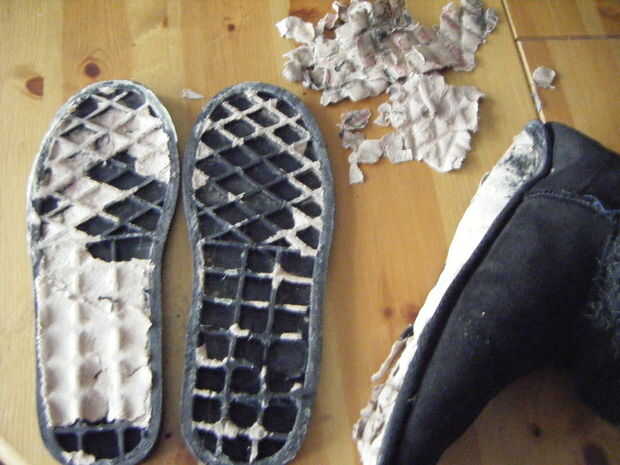 También en la foto son un par barato de imitación ugg estilo botas, previamente había cortado de la parte superior varias pulgadas y doblado sobre y cosido por la mucosa expuesta para hacer más de un par alto de tobillo de feos botines. Tomé estos aparte para las suelas. Después de arrancó la parte superior había que algo atascado en el interior de la suela que era exactamente como cartón, elegí todo, más tarde he empapado las plantas en agua caliente para aflojar el pegamento y raspar la suciedad restante. Plan sobre el uso de estas suelas para los zapatos siguiente que hago, voy probablemente corte un pedazo de goma fina, como de una estera de yoga, o tal vez un pedazo de lino, para sustituir la cartulina que estaba allí, pero supongo que cartón funcionaría también, y entonces te tratan como las suelas de flip-flop.