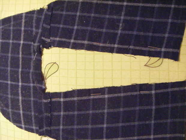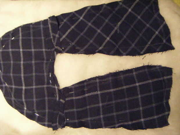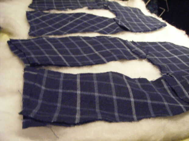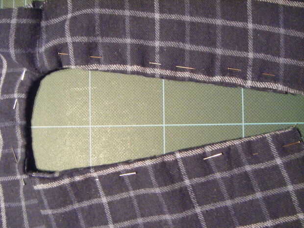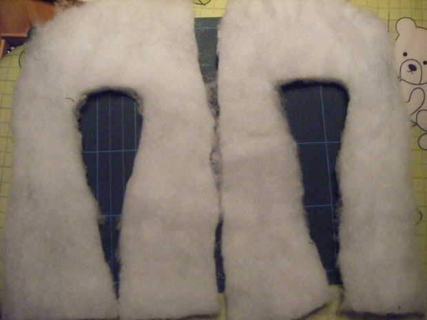 Recomiendo algo intercalando entre la cáscara y el revestimiento para el calor y también para agregar cuerpo a un tejido muy fino. (Esto no será necesario si su trabajo en algo como el cuero). Hay un montón de materiales que puede usar, he usado de bateo, la clase que usted encontrará en un tejido. Este material es extremadamente indulgente y fácil de trabajar, no tengo mucha experiencia usando y llegué muy bien. Para este proyecto tengo mi bateo de una almohada, estoy seguro de es la misma que se puede comprar en la sección de suministros de acolchado de una tienda de costura, sólo tal vez menos uniforme que si vino recién salido de un rollo. Esta capa es de 1,5 en (4.5 cm) de espesor, este material es fácil de trabajar pero querrá tener cuidado de no tirar o estirar las fibras demasiado o es delgada en algunas áreas y agrupados para arriba en otros, sin embargo es un material perdonando y es posible reparar cualquier signo de sobre exuberancia, chequeen que esté satisfecho es suficiente incluso antes de empezar a cortar el patrón de él , puede utilizar las plantillas de nuevo, o simplemente cortadas alrededor de las guarniciones de la cáscara como lo hice. Si usas papel o el material que usted ha cortado ya para trazar alrededor de definitivamente recomiendo fijar cuidadosamente antes de empezar a cortar, este material tiene una forma de disolución si no se hace cuidadosamente. A diferencia de las otras capas no necesita un margen para el bateo, que sólo se cortan en la línea.