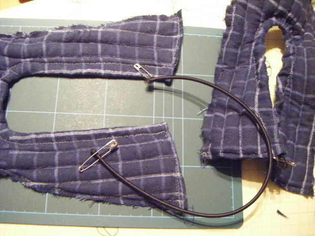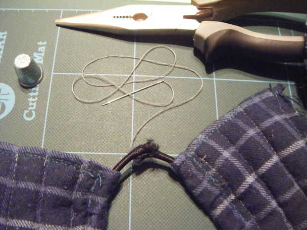 A continuación tendrás que asegurar los dos extremos del elástico junto, lo hice con aguja e hilo. Un dedal y pinzas pueden no ser necesarias, pero para un elástico denso como estaba usando definitivamente ahorrar las manos mucho daño (si usted piensa que soy una gallina creo de un dedo atravesado por el extremo del ojo de una aguja) es el dedal empujar la aguja en el elástico y el tirón de la pinza la aguja el resto a través de. Sin ellos que sólo habría sido capaz de coser en la capa externa de tejido de elástico, que está bien si eso es todo lo que puede manejar, pero a menudo causa los extremos se desgaste y se vienen desentrañando.