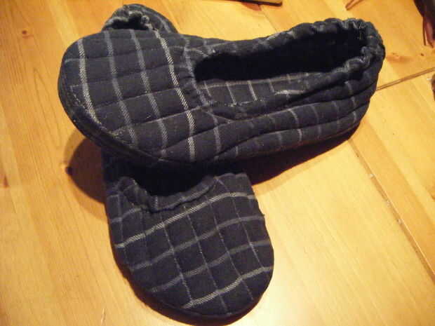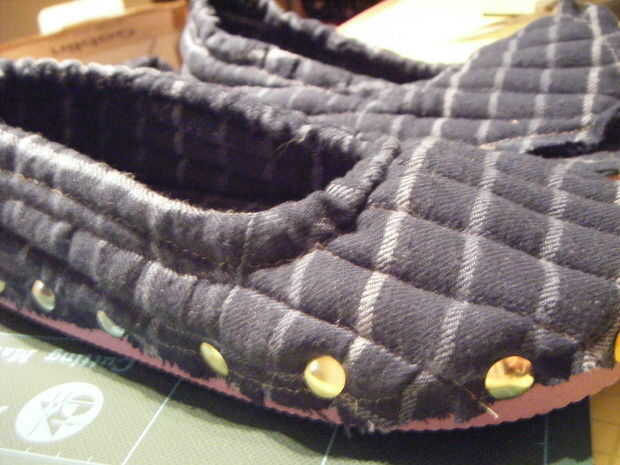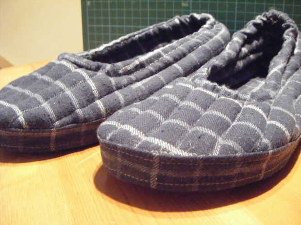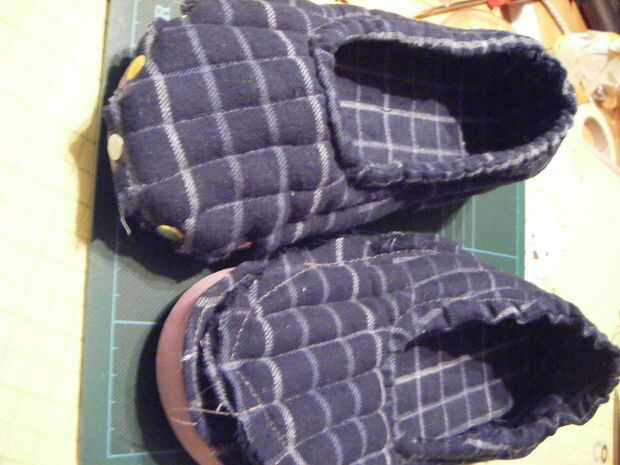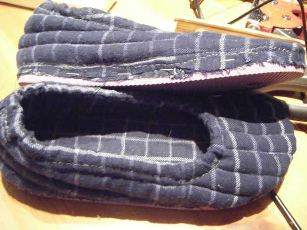 Hice mi enlace de la misma tela que he usado el zapato, ninguna razón particular, continuidad que supongo. Casi cualquier otro material que se te ocurra habría sido más conveniente. Tal vez intentaba detenerme siempre llevar afuera; a pesar de lo orgullosa que estoy de cómo resultaron estos son zapatos feos, hechos de tela de fea si me había puesto un enlace que habría al ser usado hacia fuera en la lluvia y se quedó agua apretado habría usado hacia fuera y unido con camisa impresa con una flecha apuntando hacia abajo que dice "Hice estas"! El atascamiento de franela significa que están muy bien para los zapatos de interior, (o zapatos de conducción, mantenerlos en los talones para éstos, conducir en coche y swap).